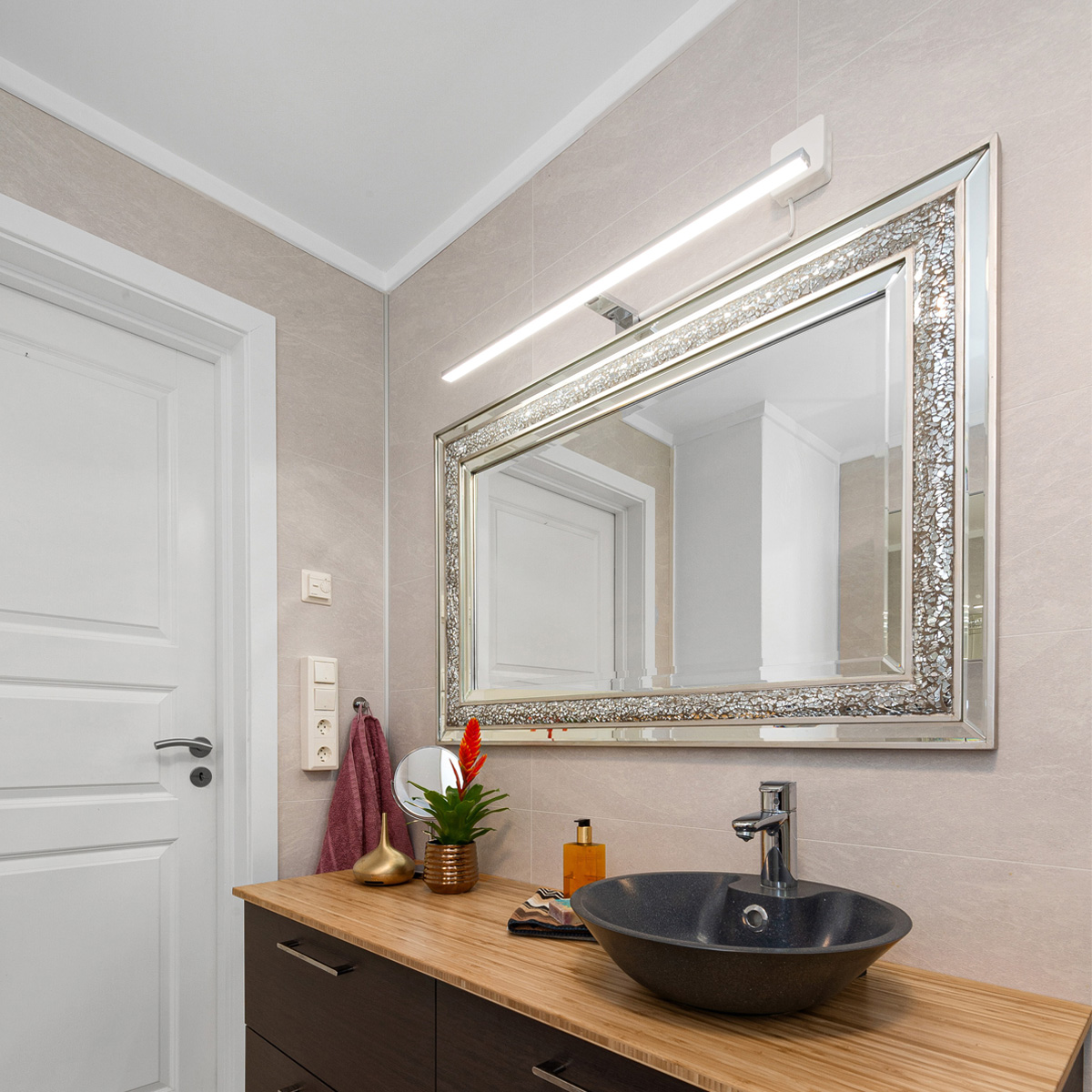 Modernisieren Sie Ihr Badezimmer mit unserer LED-Spiegelleuchte. Das edle Design lässt Ihr Bad in neuem Glanz erstrahlen und ist ein echter Blickfang. Montieren Sie die Leuchte ganz nach Wunsch vertikal oder horizontal. Profitieren Sie von der energieeffizienten LED-Technologie und somit von einem geringen Stromverbrauch.