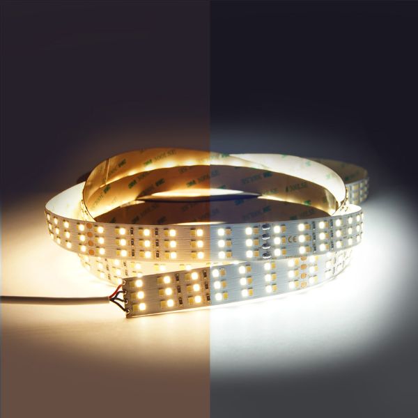 Unser 24V High Power LED-Streifen mit Hochleistungs-LEDs sorgt für eine hohe Lichtintensität und eignet sich daher nicht nur als Lichtquelle für Hintergrundbeleuchtungen, sondern vor allem auch für die direkte Beleuchtung. Die hohe LED-Dichte von 420 LEDs pro Meter garantiert eine gleichmäßige Ausleuchtung. Dank der selbstklebenden Rückseite lässt sich der LED-Streifen auf jeder festen Oberfläche anbringen. Durch die einstellbare Farbtemperatur, die stufenlos wählbar ist, kann auch nur Warmweiß oder Weiß gewählt werden. Um unterschiedliche Farbtemperaturen darzustellen, werden die Leistungswerte entsprechend angepasst. Zum Beispiel Warmweiß mit 60% und Weiß mit 40%. Es werden also nie beide LED-Typen, warmweiß und weiß, gleichzeitig mit voller Leistung angesteuert.