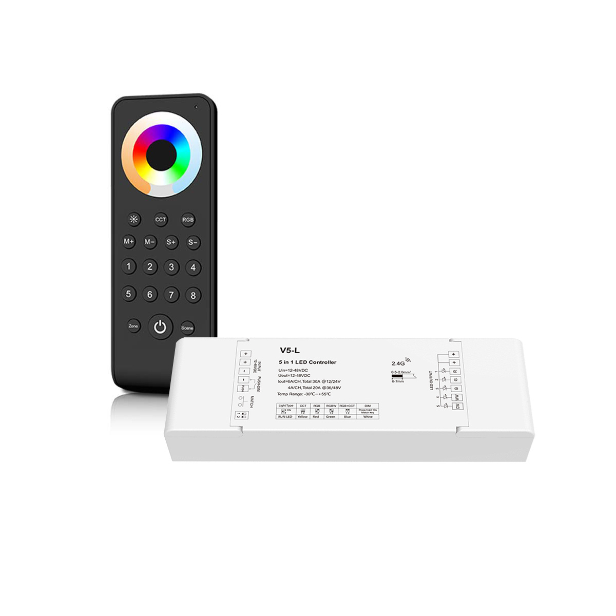 Der 5-in-1 Controller (RGB+CCT / RGBW / RGB / Weiß variabel / Single Weiß) ist drahtlos fernbedienbar und kompatibel zu unseren steuerbaren 12V bis 48V LED-Artikeln.