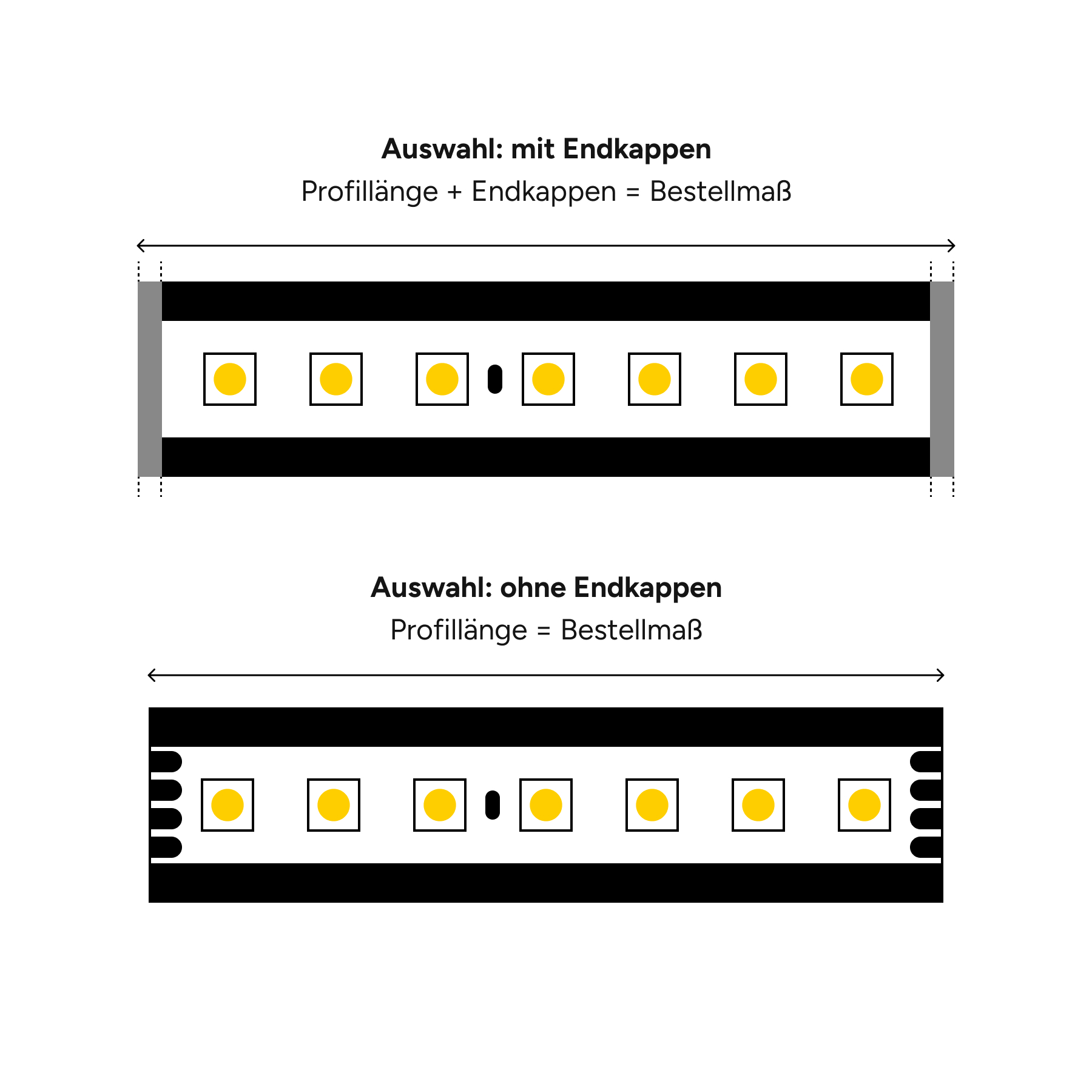 Bestellen Sie das Profil ohne Endkappen, entspricht Ihre Wunschlänge dem Außenmaß des Profils. Wählen Sie die passenden Endkappen zum Profil, berücksichtigen wir diese bei der Fertigung. Die bestellte Länge entspricht dann dem Außenmaß des Profils inkl. Endkappen.