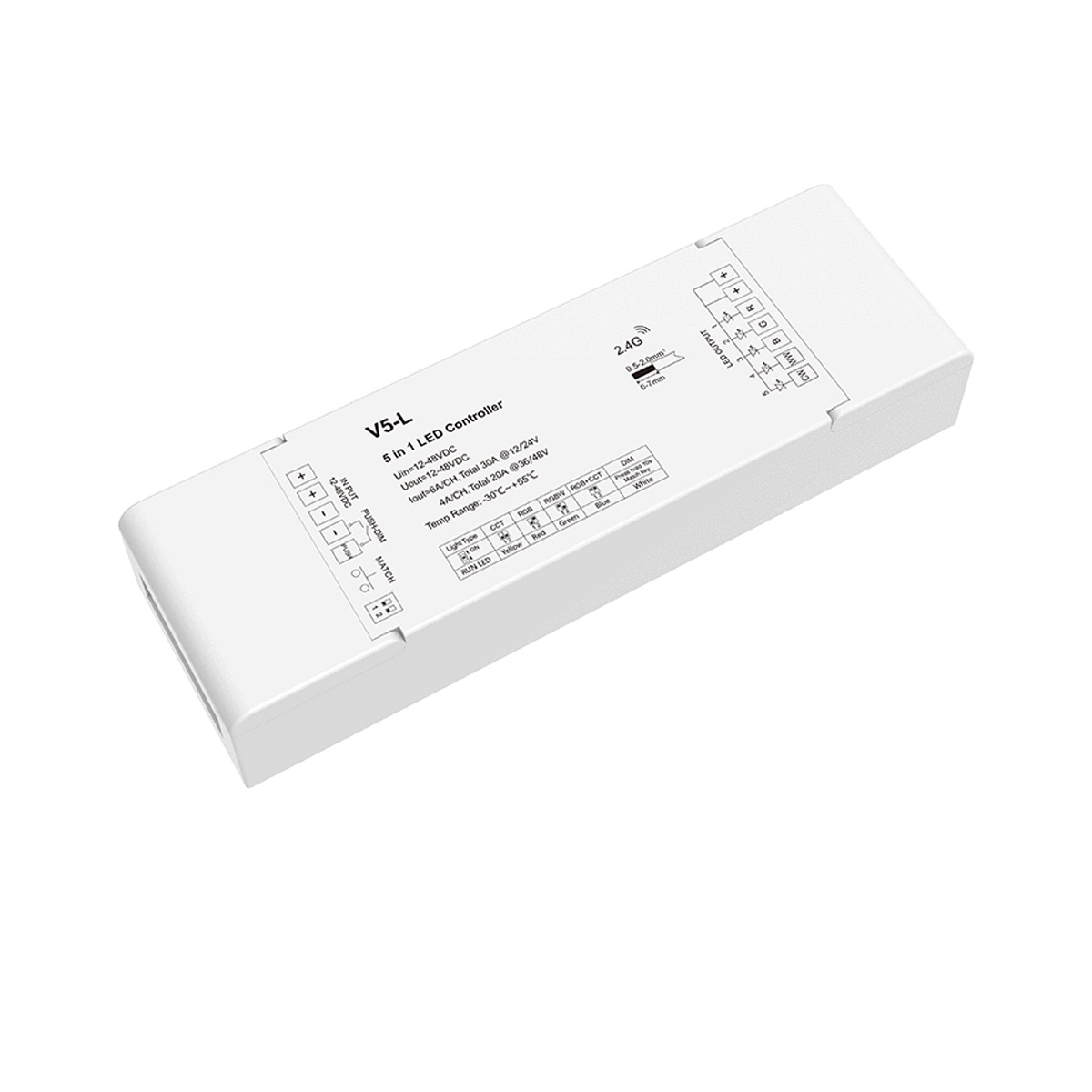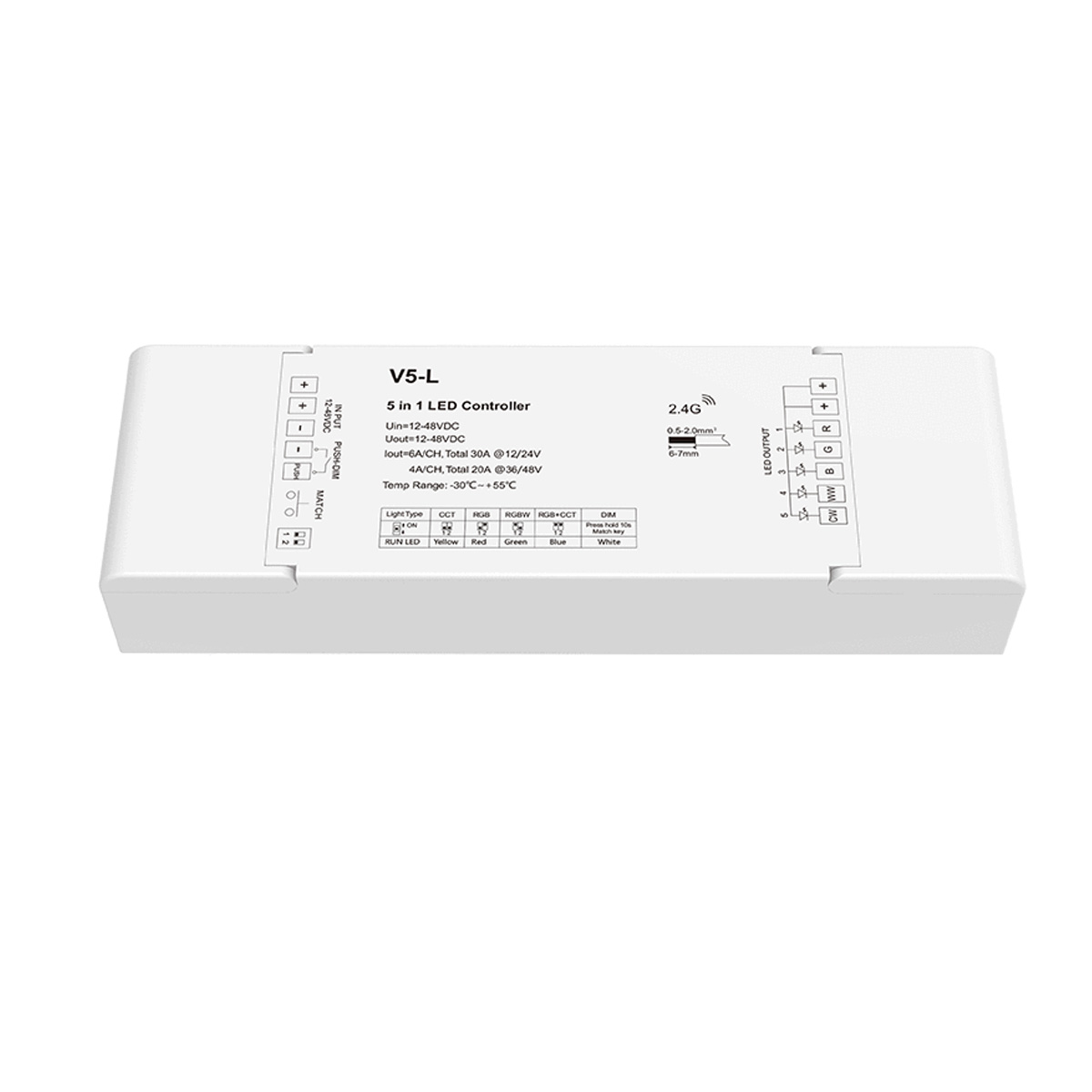 Als leistungsstarker 5-Kanal-Controller unterstützt der V5-L den Betrieb unserer 12V–48V-LED-Artikel – darunter RGB+CCT-, RGBW-, CCT- und einfarbige LED-Streifen. In Verbindung mit einer geeigneten Fernbedienung können Sie Helligkeit, Farbwechsel, Farbsättigung, Farbtemperatur sowie individuelle Lichtszenen ganz nach Ihren Wünschen einstellen und dimmen. Der V5 ist somit die perfekte Ergänzung für moderne Lichtinstallationen mit hoher Flexibilität und Benutzerfreundlichkeit.
