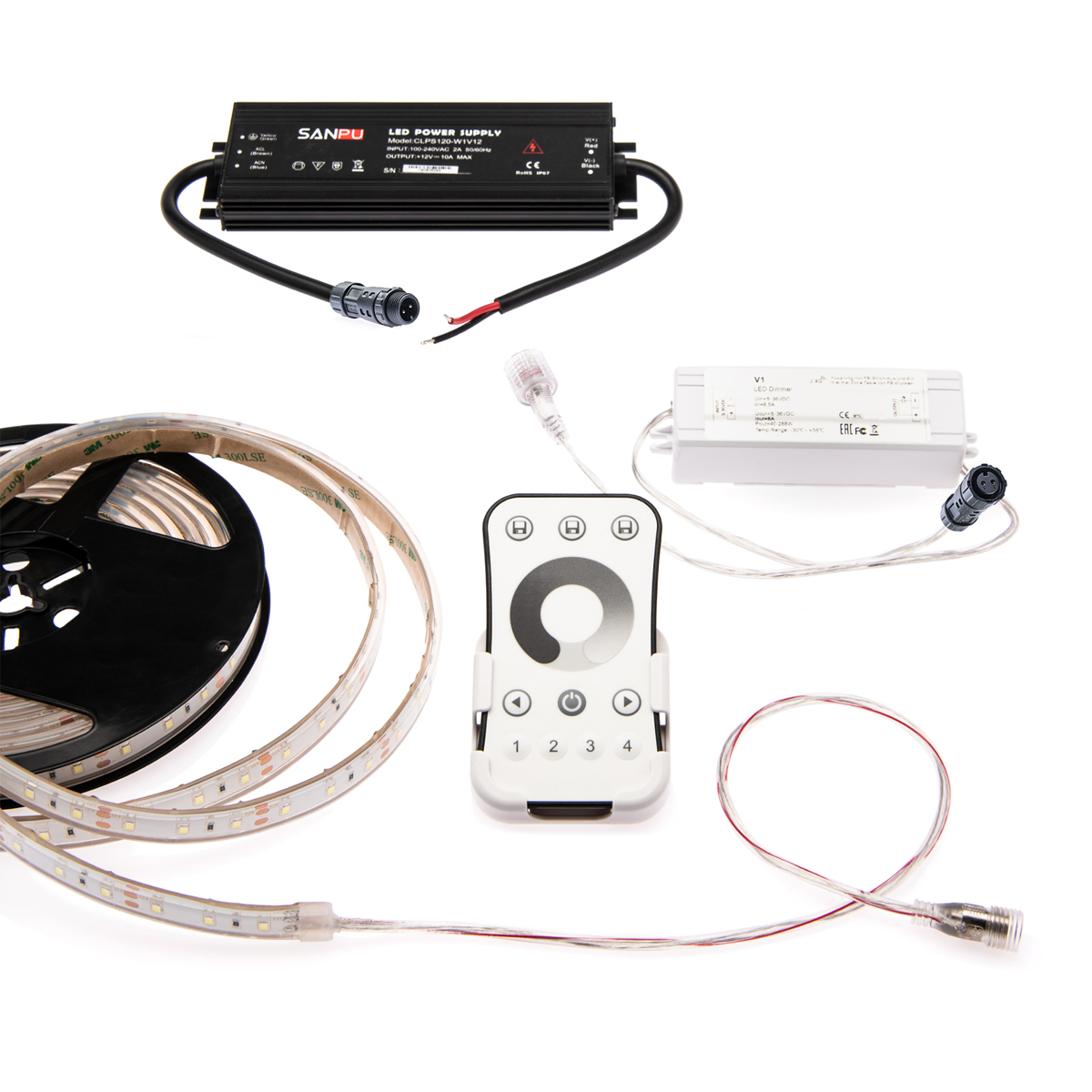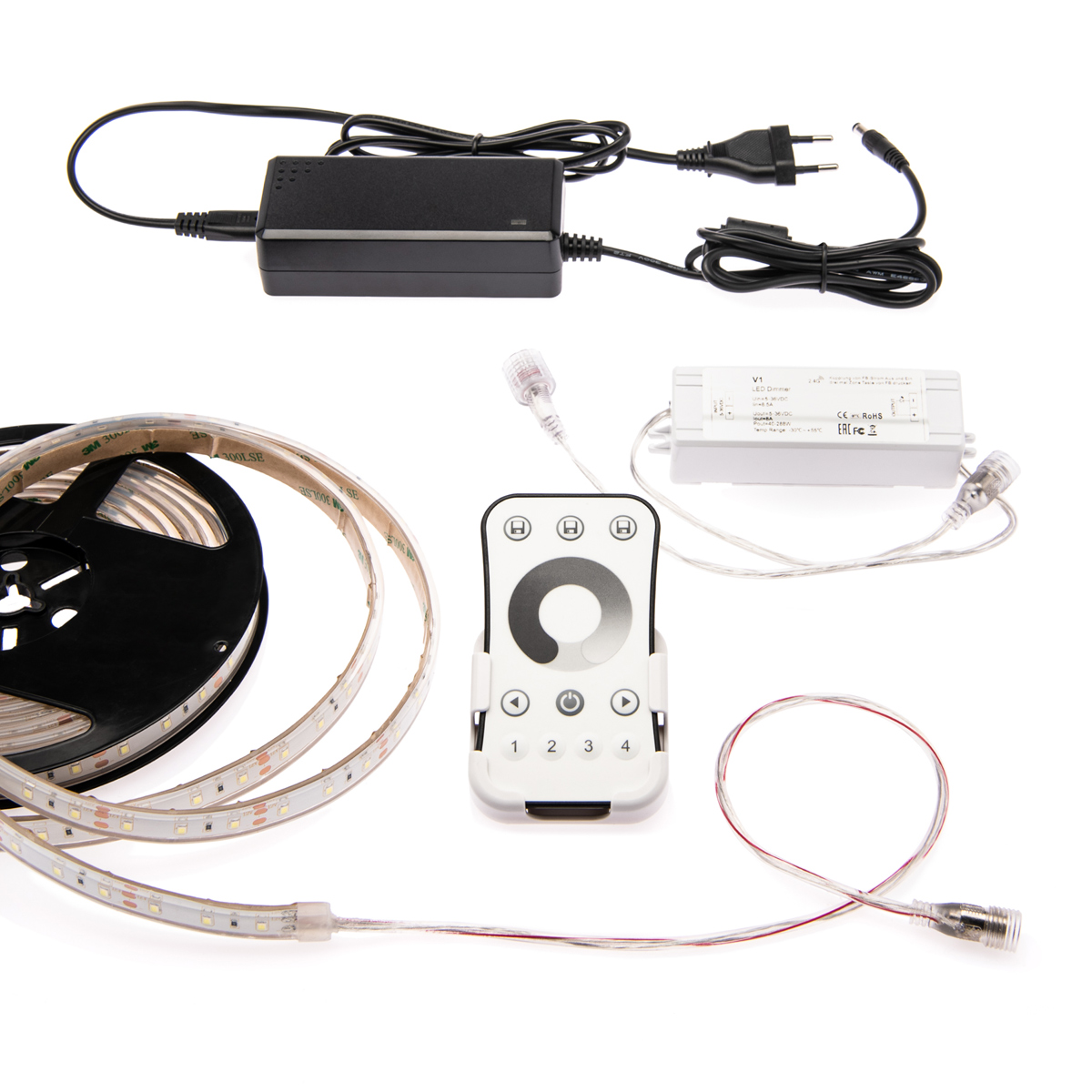 Unser wasserfestes "Plug & Play" 12V LED Streifen Set inklusive Dimmer, Fernbedienung und passendem Netzteil zeichnet sich durch seine einfache Installation aus, da die Komponenten bereits technisch aufeinander abgestimmt sind und nur noch zusammen gefügt werden müssen.