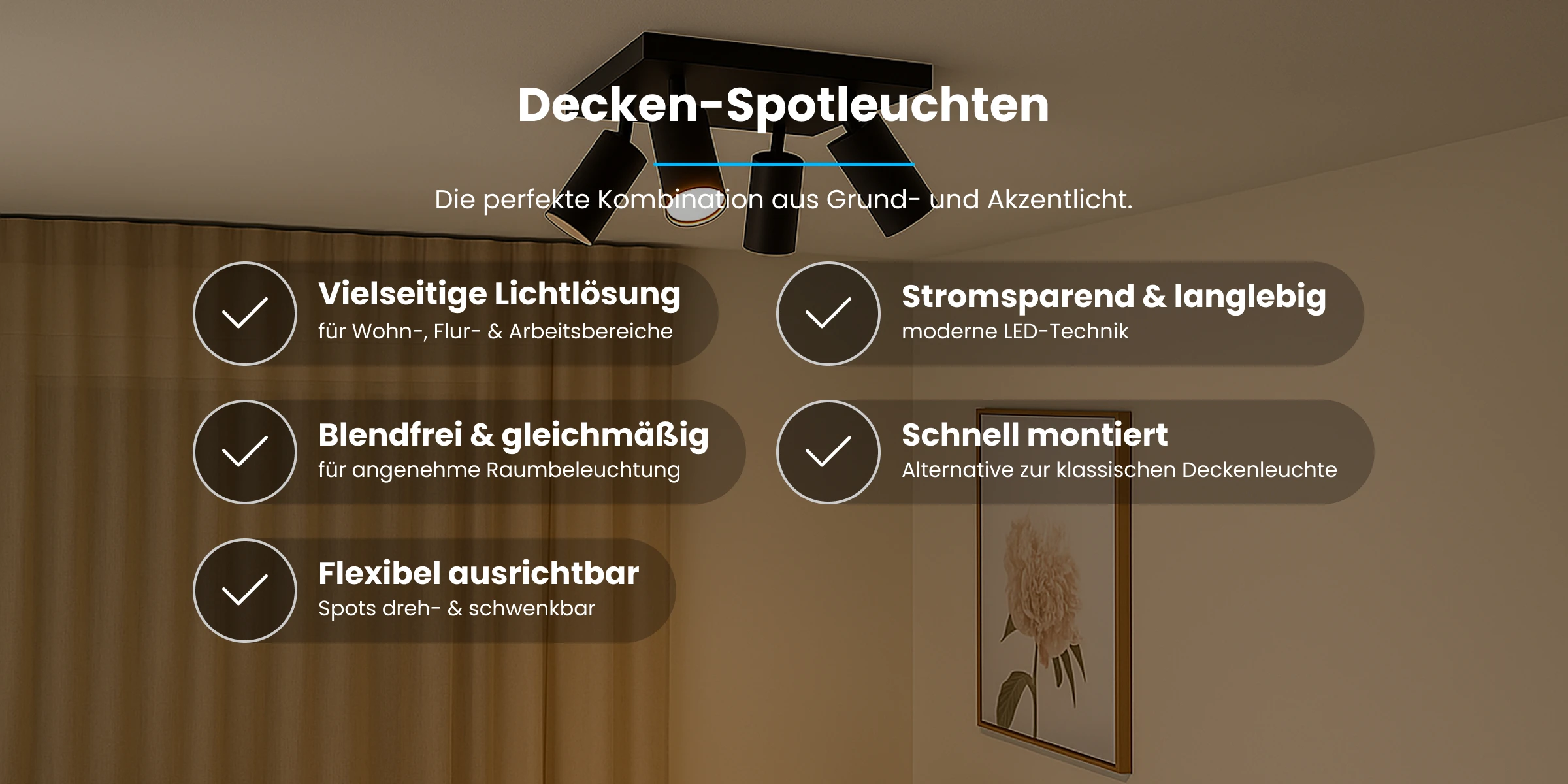 Deckenleuchten mit Spots verbinden funktionales Licht mit individuellem Design. Dank der schwenkbaren Spots können Sie die Beleuchtung dabei ganz gezielt ausrichten. Sie sind somit ideal für die Akzentbeleuchtung von Möbeln, Bildern oder Arbeitsbereichen geeignet. Gleichzeitig sorgen sie für eine angenehme Grundbeleuchtung, die sich an Ihre Raumnutzung anpassen lässt. Aufbau-Deckenspots sind die perfekte Lösung für alle, die flexibles Licht und eine moderne Optik wünschen, aber keinen Deckeneinbau vornehmen möchten. Die Spots werden direkt an der Decke montiert und lassen sich in der Regel einzeln schwenken oder drehen. So können Sie bestimmte Bereiche gezielt ausleuchten.